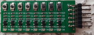 Monitoring all busses and registers would potentially require a lot of wires. To make that a bit easier, I created a small I/O board which hook up to 8 I/O pins. Each pin has got a LED driven by a MOSFET and also a button (in case it is input).